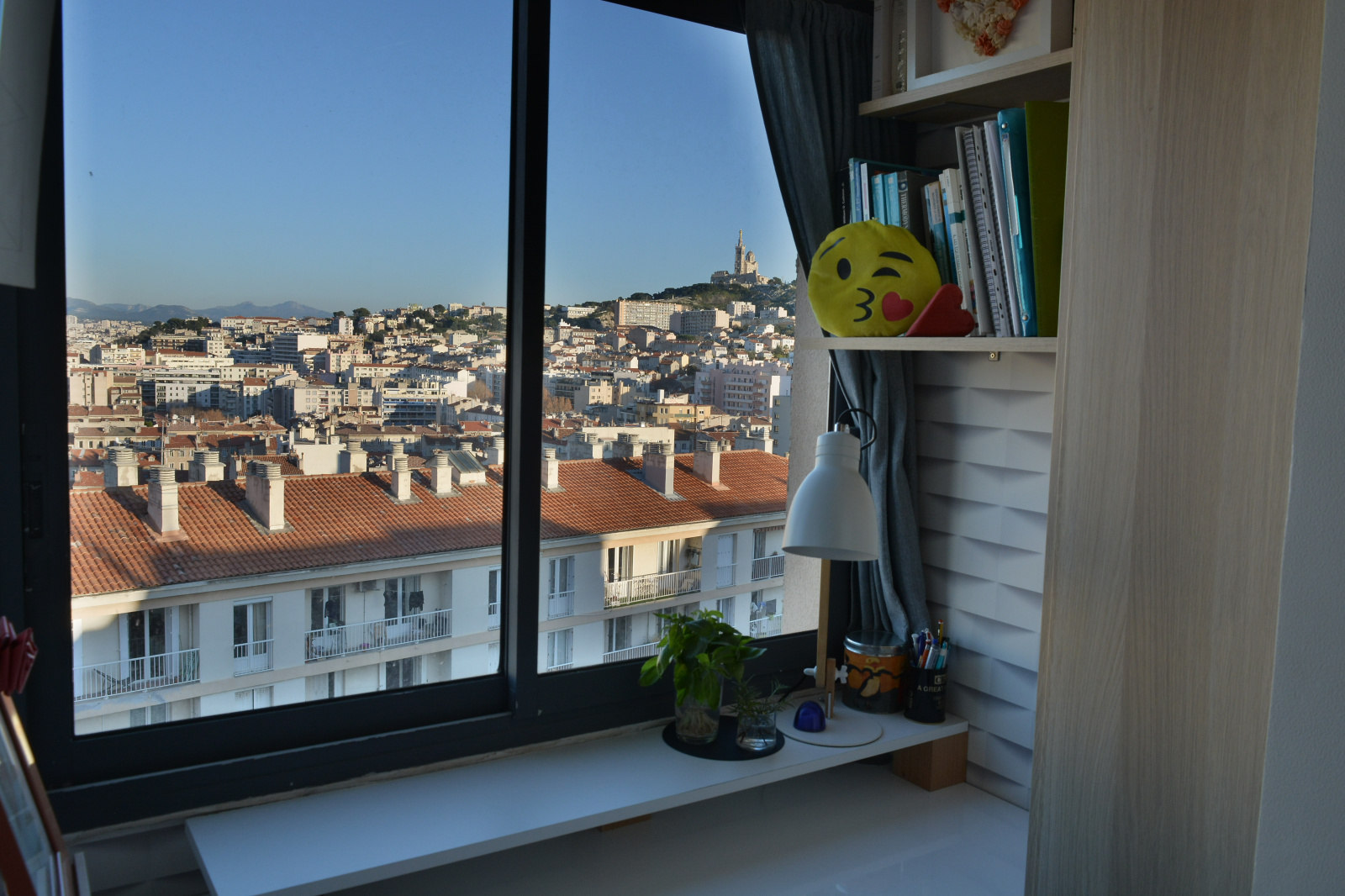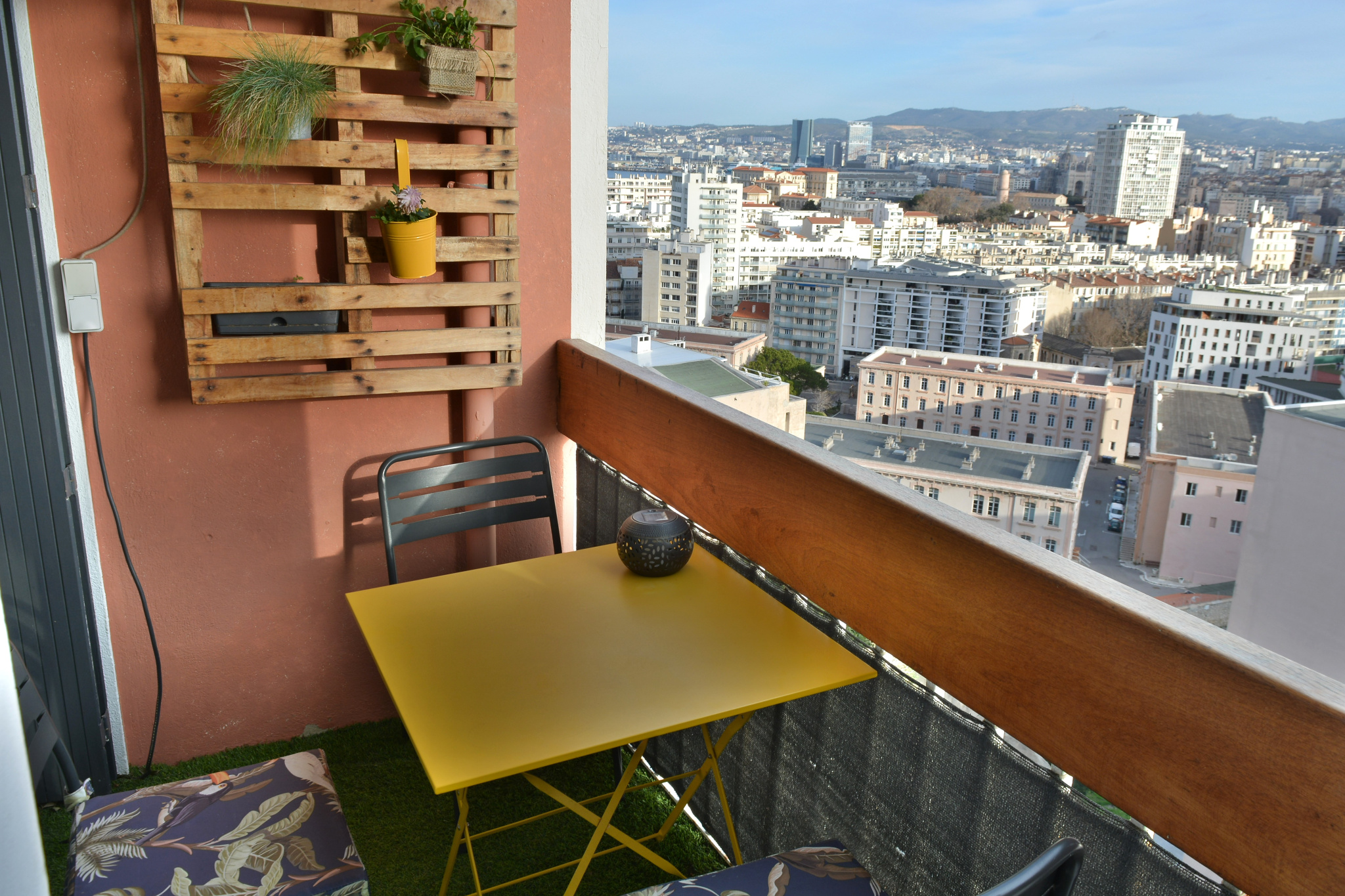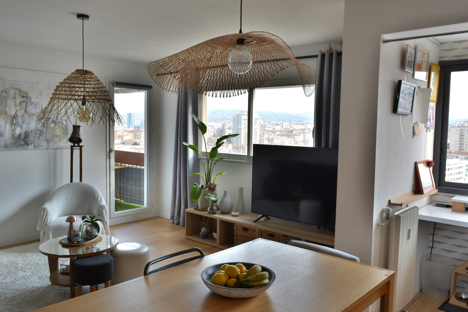 une vaste pièce de vie avec cuisine US moderne et equipée donnant sur extérieur avec vue panoramique remarquable sur la ville et le port.