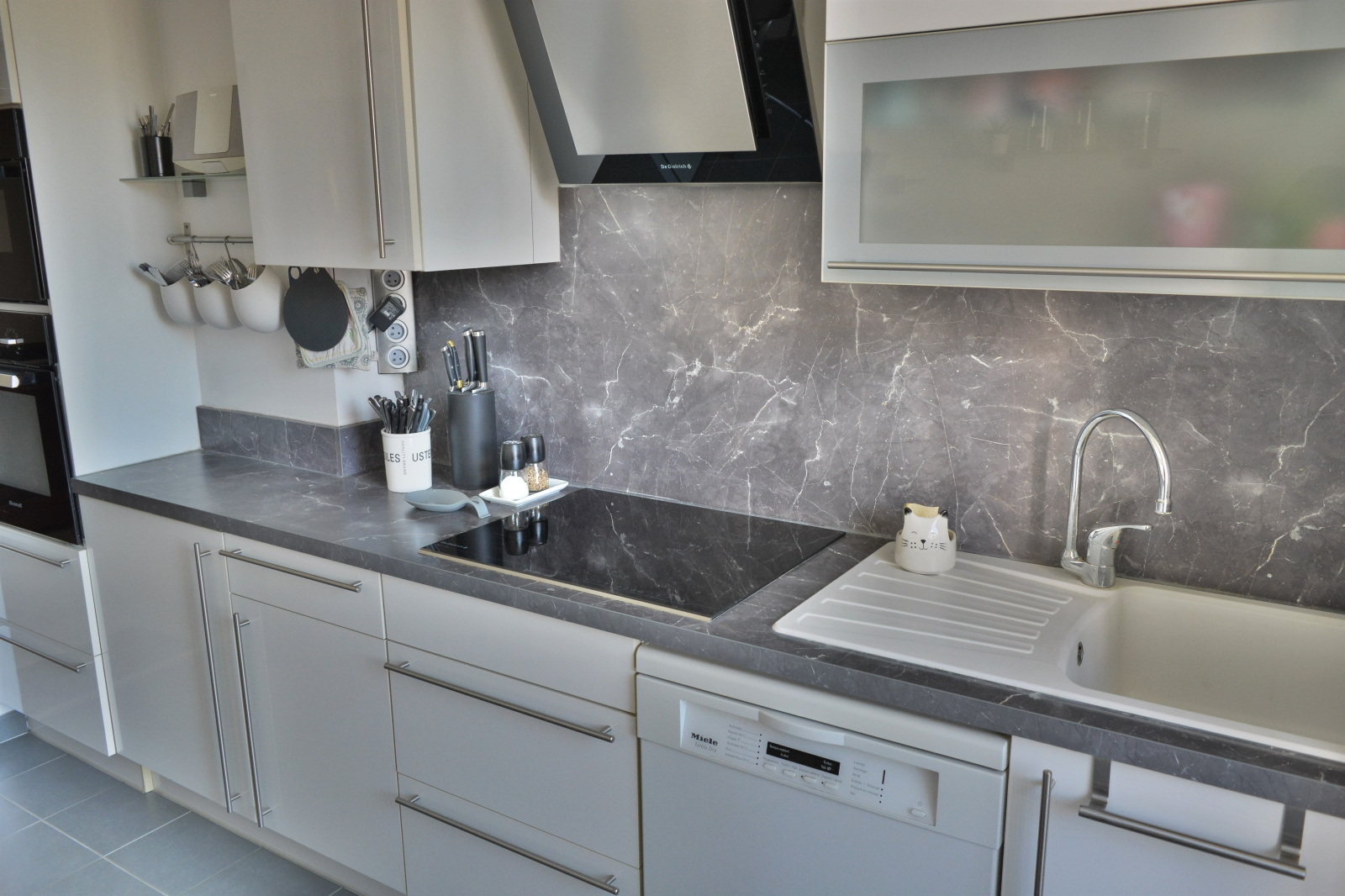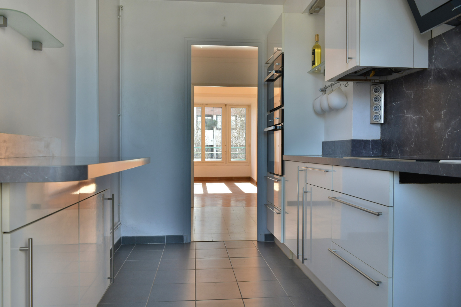une cuisine séparée, moderne, donnant sur beau balcon fermé de 9m² avec jolie vue