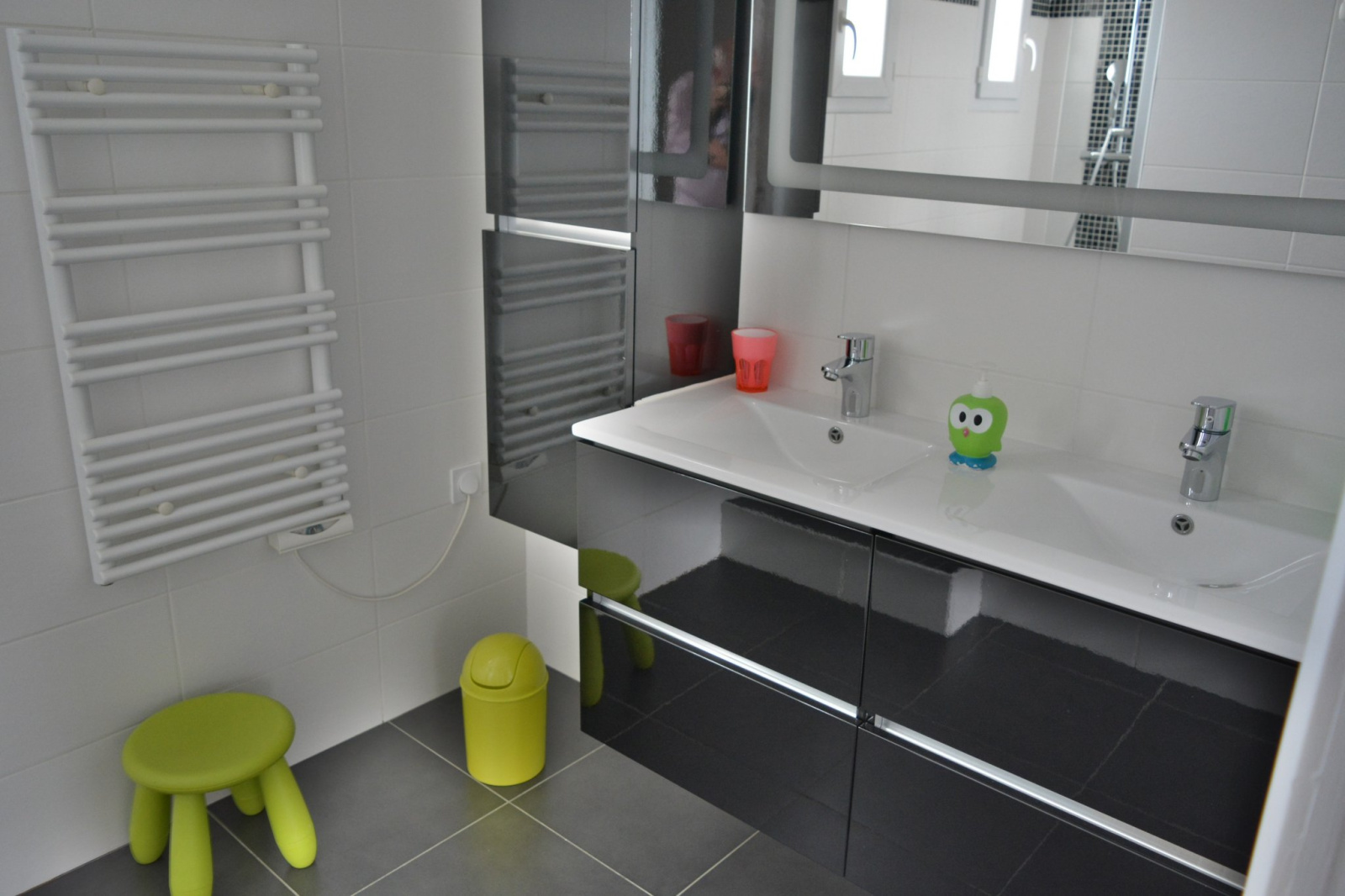 A l'étage: 3 chambres de 9 m² avec rangements dont une avec vue mer, une salle d'eau et un wc séparé.