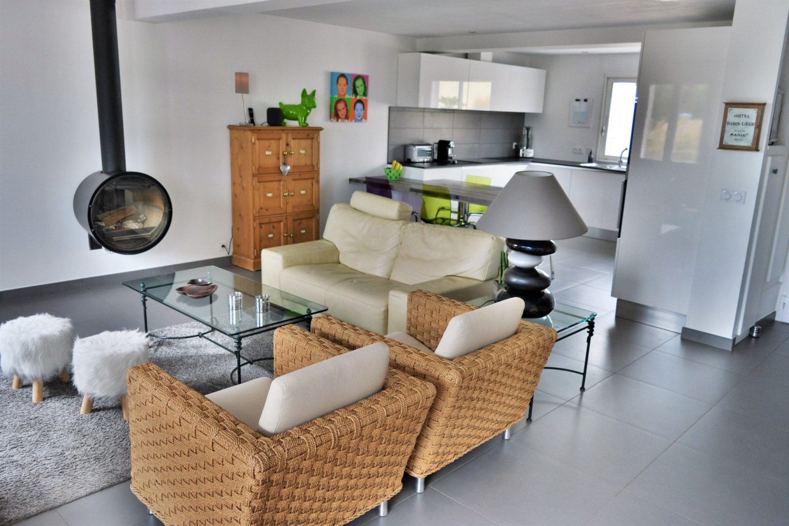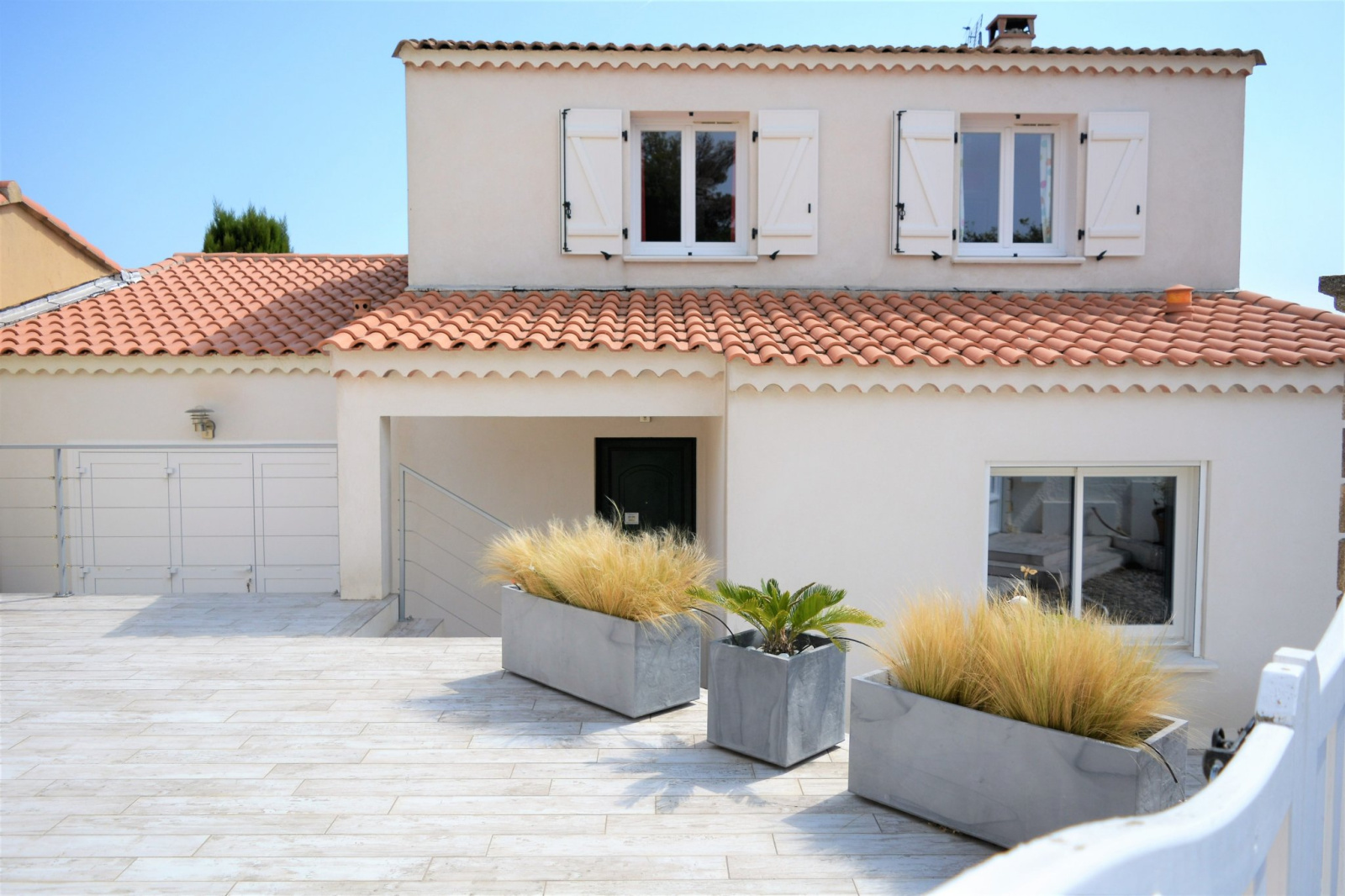 Elle est composée au Rdc d'un vaste séjour cuisine us de 47 m² plein sud avec poele à bois et donnant sur belle terrasse en IP de 16m² avec vue sur jardin et piscine, une superbe suite parentale de 25 m² avec vue mer, bureau, salle de bain et wc.