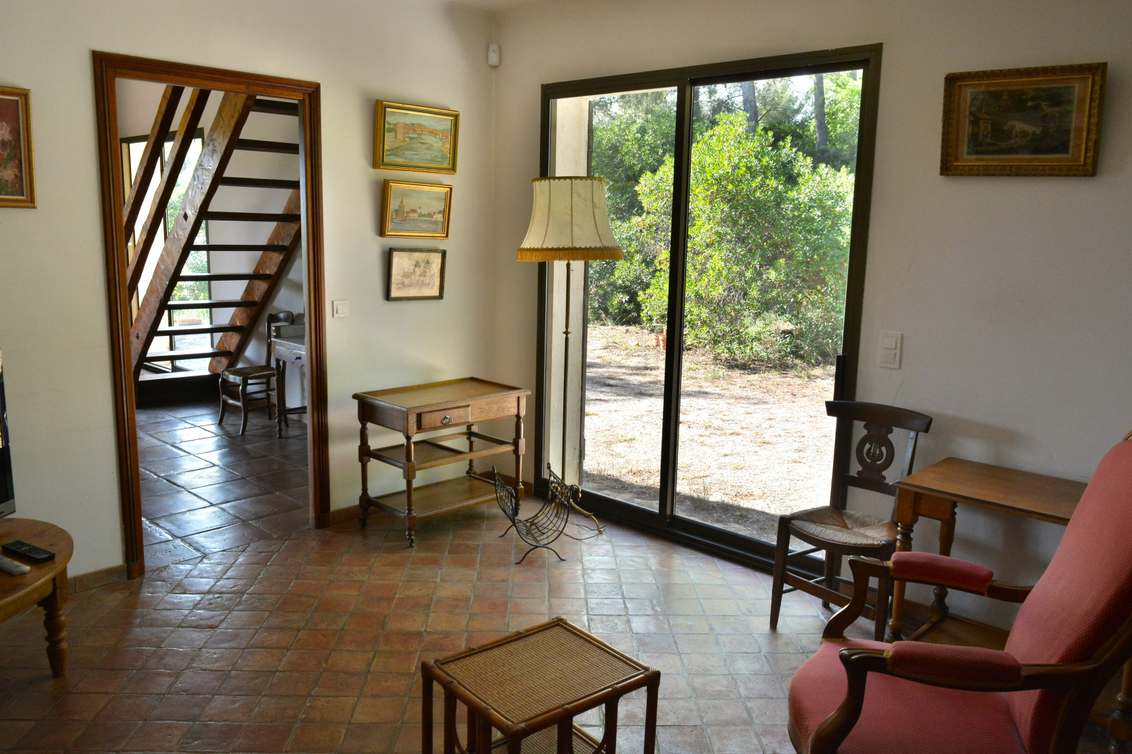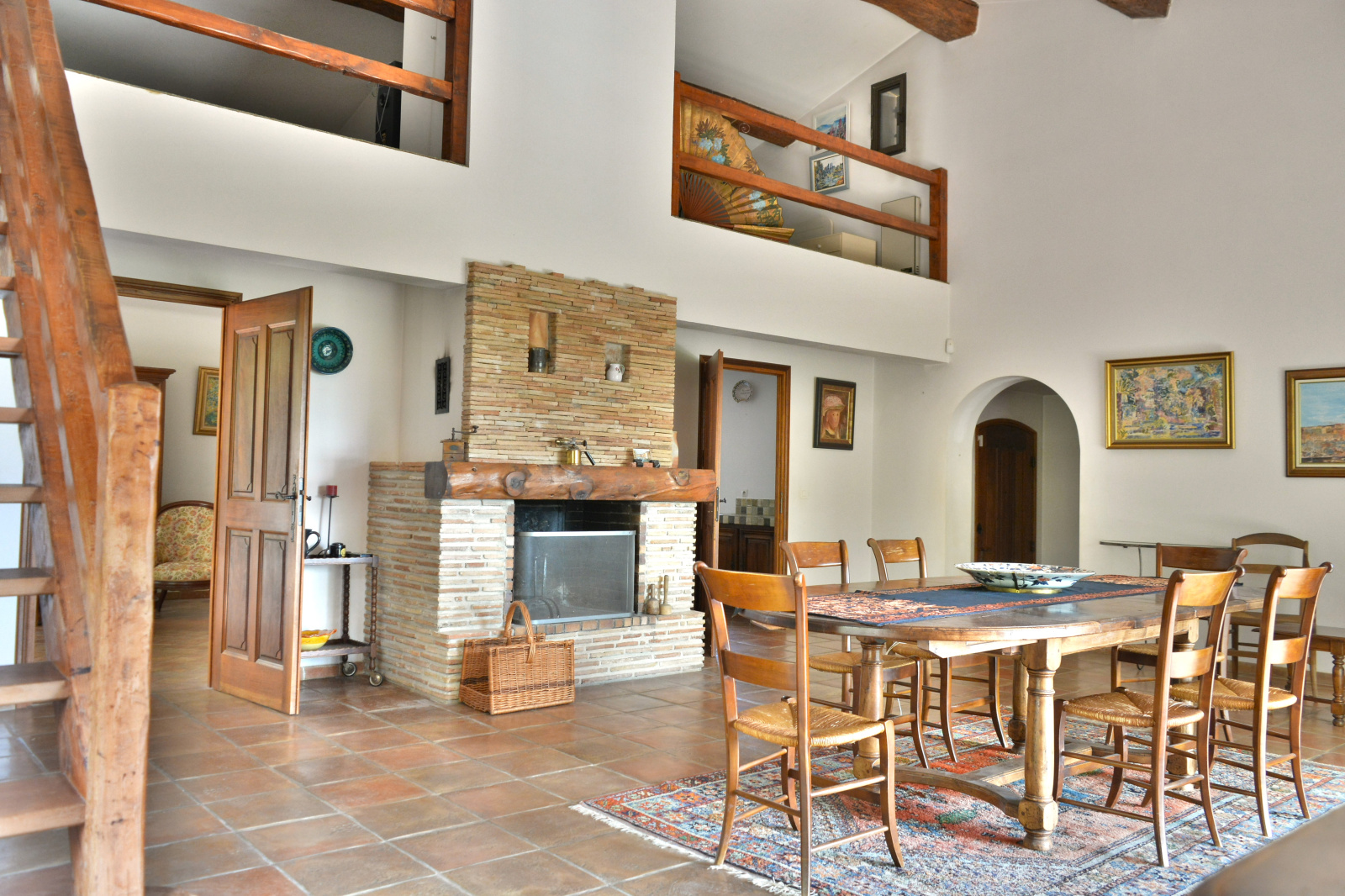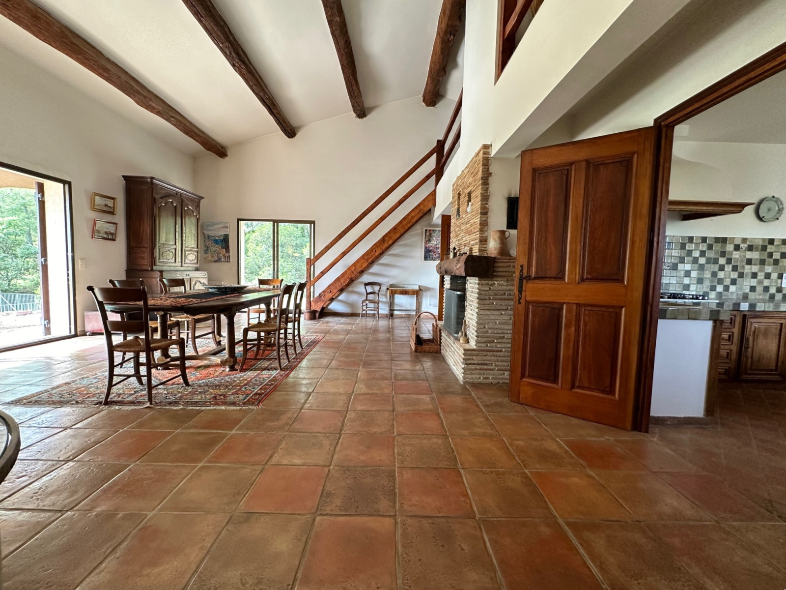 poutres apparentes, mezzanine, terre cuite de Salerne et baies vitées donnant sur nature, terrasse et piscine.
